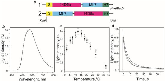 (a) Schematic representation of genetic constructs of hybrid proteins based on MLuc7 and 14D5a single-chain antibody for production in baculovirus expression system. S, MLuc7 secretion peptide; ML7, MLuc7 luciferase sequence without secretion peptide; 14D5a, 14D5a single-chain antibody; H7, His7-tag. (b–d) Properties of 14D5a-MLuc7 (grey lines and circles) and MLuc7-14D5a (dashed lines and open circles) hybrid proteins vs those of wild type MLuc7 (black lines or circles). (b) Bioluminescence spectra recorded at 23 °C. (c) Effect of temperature on bioluminescence activity (data represent average of 3 independent experiments for each protein). (d) Kinetics of bioluminescent reaction recorded at 23 °C. The measurements were performed in ML-buffer with 1:10,000 protein/substrate molar ratio. Light intensity is expressed as relative to peak values (rlu, relative light units).