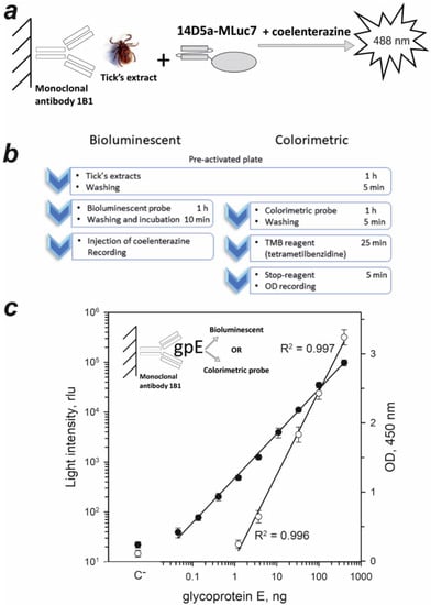To estimate the prospects of 14D5a-MLuc7 hybrid protein as a bioluminescent probe, the sandwich-type immunoassay of TBEV native gpE in tick extracts was performed. We first determined the dose-response curve of 14D5a-MLuc7 for recombinant gpE (Figure 3a). The light signal of the 14D5a-MLuc7 hybrid protein was linear for gpE concentrations ranging from 0.045 to 400 ng (R2 = 0.997) (Figure 3c) and the detection limit was estimated to be 45 pg, calculated as a mean of background signals from three wells plus 2 standard deviations. For comparison, the colorimetric immunoassay with peroxidase as a label was also performed applying a commercial kit to detect TBEV native gpE (Vector-Best, Novosibirsk, Russia). According to the dose-response curve, the optical density was linearly dependent on gpE concentration in the range of 1.23–400 ng (R2 = 0.996) (Figure 3c). The detection limit was estimated to be 1.23 ng of gpE. Thus, sensitivity of bioluminescent assay appeared to exceed that of colorimetric assay ~30-fold. It is worth noting that gpE detection limit with 14D5a-MLuc7 hybrid protein was comparable with that determined for 14D5a-Rm7 hybrid protein (56 pg) [], even despite the fact that bioluminescence activity was measured at room temperature which is higher than optimal for the bioluminescence activity of 14D5a-MLuc7 (Figure 1c). It is remarkable that the temperature optimum of bioluminescence reaction catalyzed by Renilla luciferase is found to be 32 °C [] and consequently the room temperature at which the detection limit for 14D5a-Rm7 was determined is also not quite optimal for measuring the activity of this enzyme.