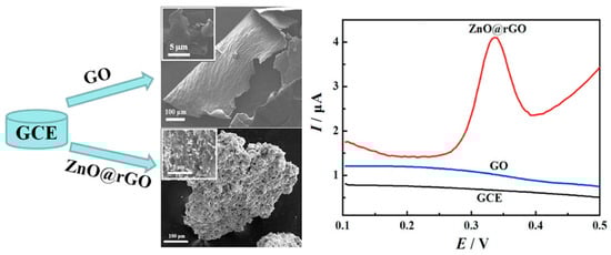 Hao et al. [26] have prepared a nanocomposite using reduced graphene oxide (rGO) and ZnO nanoparticles (ZnO@rGO) via an in situ reduction of graphene oxide (GO) with Zn powder and coated glassy carbon electrode (GCE) (Figure 1). The ensuing system (ZnO@rGO/GCE), characterized by scanning electron microscopy (SEM) and transmission electron microscopy (TEM), gave significantly enhanced oxidation signals of o8dGuo, compared with unmodified GCE and GO-modified GCE (GO/GCE), as verified by cyclic voltammetry (CV). With the enzyme uricase, the interference of uric acid (UA) was effectively eliminated and accurate sensing of o8dGuo was attained. The linear range of 5 to 5000 nM for the detection of o8dGuo using ZnO@rGO/GCE has been achieved using differential pulse voltammetry (DPV). The limit of detection (LOD) was 1.25 nM.