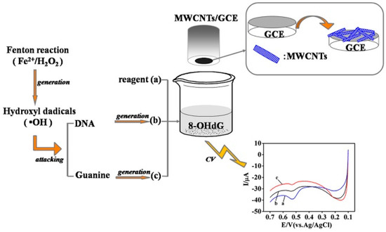 Glassy carbon electrode (GCE)/multi-walled carbon nanotubes (MWCNT) sensor for the determination of o8dGuo. Reprinted with permission from Reference [28]. © 2016, Elsevier.