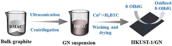 Cao et al. [32] prepared graphite nanosheets (GN) in a very simple liquid-phase exfoliation of graphite in N,N-dimethylacetamide (DMAc). Ultra-small (less than 5 nm) Cu-based metal organic framework (HKUST-1) nanoparticles were in situ anchored on the surface of GNs with a high degree of dispersion (Figure 4). The synthesized hybrids of graphite nanosheets (HKUST-1/GN) decorated with HKUST-1 nanoparticles, characterized by powder X-ray diffractometry (XRD), thermogravimetric analysis (TGA), SEM and TEM, showed excellent electrochemical sensing performance towards the DNA damage biomarker o8dGuo. The DPV concentration measurement was characterized with a fast detection speed (~240 s), wide linear window (10 nM–1 µM), high sensitivity (346,857 µA mM−1 cm−2), low LOD (~2.5 nM) and good reproducibility.