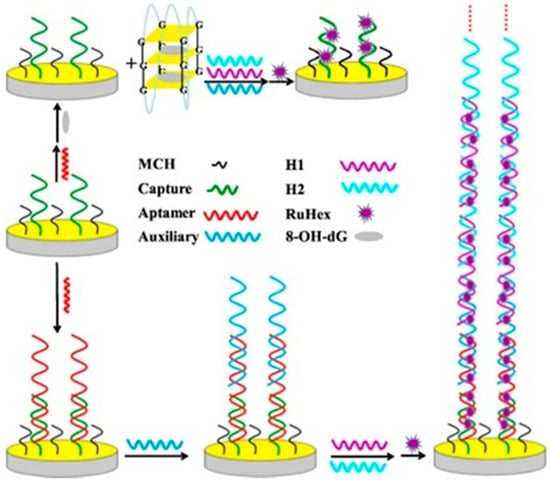 An aptamer-based electrochemical biosensor with hybridization chain reaction (HCR) signal amplification for the detection of o8dGuo. Reprinted with permission from Reference [34]. © 2018, Elsevier.