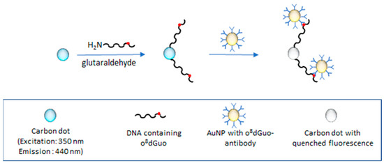 Hu et al. [36] have developed a fluorometric immunoassay, based on strongly photoluminescent and excellently photostable carbon quantum dots (CQDs) and AuNPs, for determining DNA containing oxidatively damaged o8dGuo. The morphology and sizes of AuNPs and CQDs were observed by TEM. In a test experiment, CQDs were modified with glutaraldehyde for conjugation of DNA-o8dGuo, used as the damaged DNA model. AuNPs were functionalized by o8dGuo antibody. The specific reaction of o8dGuo and o8dGuo antibody brought CQDs and AuNPs into close distance. When the CQDs were excited by UV light, emission of CQDs was quenched by AuNPs. The target DNA-o8dGuo was detected by recording the quenched fluorescence spectra with an LOD of 7 pM in the 10 pM to 25 μM DNA-o8dGuo concentration range (the paper erroneously gives 700 pM as LOD). The drawback of the method is that it requires DNA-o8dGuo isolated from urine and anchored to the glutaraldehyde-modified CQD, while urine contains more free OG than DNA-attached o8dGuo (Figure 8).