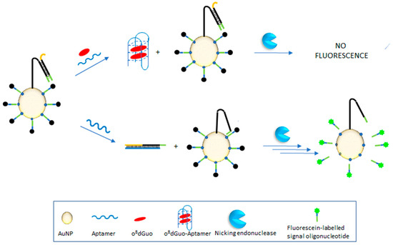 Wei et al. [37] developed an ultrasensitive method based on fluorometric determination of o8dGuo by using a three-dimensional (3D) DNA nanomachine. The nanomachine was constructed by assembling hundreds of carboxyfluorescein-labeled single-stranded DNA (ssDNA) oligonucleotides (acting as signal reporter, the latter were quenched by AuNPs until the protecting DNA were present) and tens of swing arms (acting as single-foot DNA walkers) on AuNPs. The activity of this DNA nanomachine was controlled by introducing the protecting oligonucleotides. In the presence of an aptamer against o8dGuo, the protecting oligonucleotides are removed from the swing arms due to DNA strand displacement reaction. In the next step, the detached DNAwalker (DW) hybridizes to the labelled DNA so that the DNA nanomachine becomes activated. Special sequences of signal reporter in the formed duplex can be recognized and cleaved by nicking endonuclease (NEase). This process gives an energy input for the DW to autonomously and progressively move along the surface of the AuNP, to release hundreds of signal reporters causing a rapid increase in green fluorescence. This 3D nanomachine detects o8dGuo in concentrations as low as 4 pM because one aptamer can release hundreds of signal reporters. The linear response range extends from 0.02 to 70 nM. The method worked in the diluted human serum (1:10 ratio) samples spiked with various concentrations of o8dGuo. This method is not as fast as the previously reported method based on aptamer and unmodified AuNPs [38] because of several incubation procedures, but the LOD of this method is lower by nearly three orders of magnitude than that of earlier methods (Figure 9).