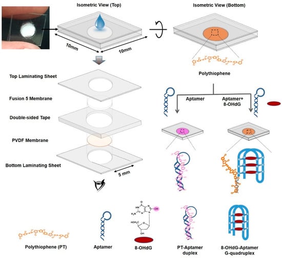 Ammanath et al. [39] have reported a naked eye detection of o8dGuo by a luminescent paper-based device using a membrane impregnated with an aptamer, as an o8dGuo recognition element, and poly(3-alkoxy-4-methylthiophene (PT)), a dye that changes its optical properties upon interaction with an aptamer in the presence/absence of o8dGuo (Figure 10).