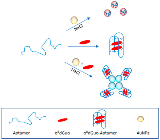 A similarly sensitive and specific colorimetric method has been elaborated earlier by Wang et al. [38] for urine sample analysis. The method consists of three steps: (1) the aptamer was adsorbed on the surface of AuNPs which enhances their stability, (2) upon addition of o8dGuo, the conformation of the aptamer changes to form a GQ structure and (3) as a consequence, it loses the ability to protect the nanoparticles and causes a color change from red to blue. The conformational changes were also studied by circular dichroism (CD). The response is linear in the range from 5.6 to 282 nM, LOD is 1.7 nM (Figure 11).