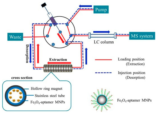 Gan and Xu [45] have developed a novel aptamer-based online magnetic solid phase extraction (MSPE) method for the selective determination of o8dGuo in human urine (Figure 13). Magnetic aptamer adsorbent (Fe3O4-aptamer MNPs) was synthesized for the selective extraction of o8dGuo by crosslinking amino-functionalized-Fe3O4 with an o8dGuo aptamer by glutaraldehyde and fixed into a stainless-steel tube as the sorbent of MSPE. After selective extraction by the aptamer adsorbent, the adsorbed o8dGuo was desorbed dynamically and analyzed online by HPLC–MS. The synthesized sorbent presented outstanding features, including specific selectivity, high enrichment capacity, stability and biocompatibility. Moreover, the proposed MSPE–HPLC–MS method can achieve adsorption and desorption operation integration, greatly simplify the analysis process and reduce human errors. When compared with offline MSPE, a sensitivity enhancement of 800 times was obtained for the online method. Some experimental parameters, such as the amount of the sorbent, sample flow rate and sample volume, were optimized systematically. Under the optimal conditions, low limit of detection (35.3 pM, S/N = 3), limit of quantity (106 pM, S/N = 10) and wide linear range (177 pM–706 nM) were obtained for the method and with good recoveries of o8dGuo in urine samples (82–116%). The method is simple, and the extraction, desorption and separation steps can be completed within 11 min. This selective, sensitive and automated method is expected to become a potential approach for the selective determination of trace o8dGuo in complex urinary samples (Figure 13).