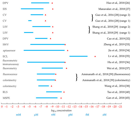 Measurement ranges (blue bars) and LOD values (red triangles) of quantitative analytical methods. The quantitation methods are listed on the left, the references on the right side.