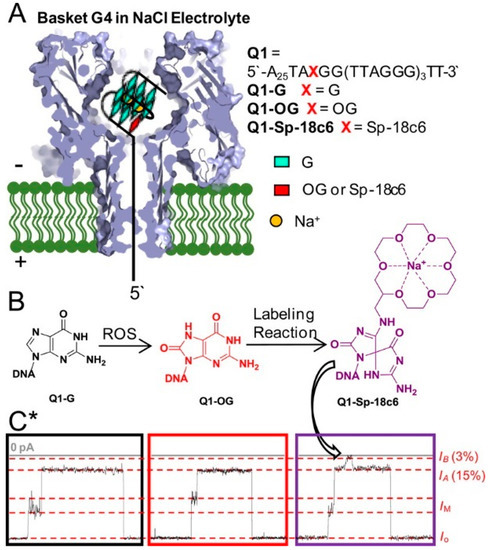 The schematic representation of α-hemolysin (α-HL) nanopore technology to detect OG. (A) Scheme for experimental setup, including the G4 sequence studied and location of the OG and Sp-18c6-labeled OG. (B) Reaction scheme for G conversion to OG by ROS, followed by labeling of OG with aminomethyl-18c6 (18c6) in the presence of the mild one-electron oxidant K2IrBr6 to furnish the labeled OG product, Sp-18c6. (C) Current vs time traces for Q1-G (black box, left), Q1-OG (red box, middle), and Q1-Sp-18c6 (purple box, right). Reprinted with permission from Reference [46]. © 2015, American Chemical Society.