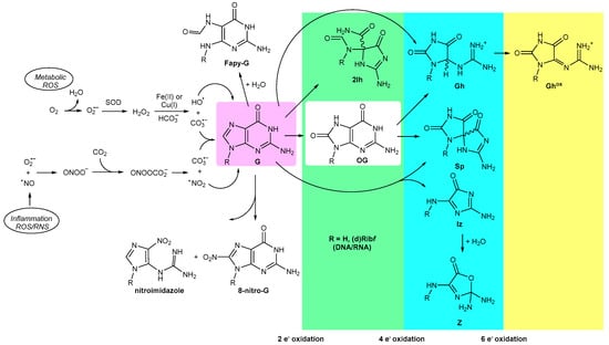 The formation of OG is a two-electron oxidation event followed by further oxidative and hydrolytic transformations, resulting in additional products (Scheme 1). The frequency of OG formation is ca. 1 in 106 [18], while that of the four-electron (spiroiminodihydantoin (Sp), 5-guanidinohydantoin (Gh), and imidazolone (Iz)) and six-electron oxidation (5-guanidino- dehydrohydantoin (Ghox)) and hydrolysis products (2,6-diamino-4-hydroxy-5-formamido- pyrimidine (Fapy-G), oxazolone (Z)) is much lower [18,19], therefore our treatment is limited mostly to the analytical and structural studies related to OG (the formation of OG dominates under aerobic conditions, while the yield of Fapy-G increases under anaerobic conditions [18]). The temporal frame of our review encompasses papers from the last five years with occasional reference to earlier papers when justified.