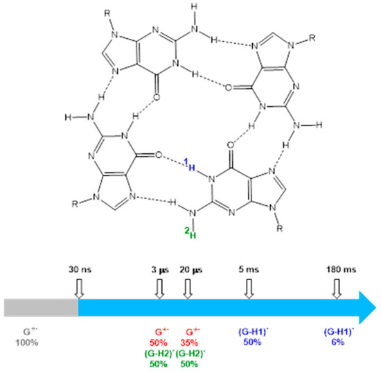 Banyasz et al. [41] have carried out the first study on oxidative damage of human telomere GQs without the mediation of external molecules. The investigation has been performed for GQs formed by folding of heneicosamer d(GGG(TTAGGG)3) single strands in buffered solutions containing Na+ cations (TEL21/Na+). Coupling nanosecond time-resolved spectroscopy and quantum mechanical calculations (TD-DFT), the study focused on the primary species, ejected electrons and guanine radicals, generated upon absorption of UV radiation directly by TEL21/Na+. At 266 nm, corresponding to an energy significantly lower than the guanine ionization potential, the one-photon ionization quantum yield was 4.5 × 10−3, this value is comparable to that of cyclobutane thymine dimers, the major UV-induced lesions in genomic DNA (quantum yield = (1.1 ± 0.1) × 10−3). The fate of guanine radicals, generated in an equivalent concentration with that of ejected electrons, has been followed over five orders of magnitude of time. Such a quantitative approach reveals that an important part of radical cation population survives up to a few milliseconds, whereas radical cations produced by chemical oxidants in various DNA systems are known to deprotonate, at most, within a few microseconds. Under the same experimental conditions, neither one-photon ionization nor long-lived radical cations are detected for the telomere repeat d(TTAGGG) in single-stranded configuration, showing that secondary structure plays a key role in these processes. Two types of deprotonated radicals are identified: on the one hand, (G-H2)• radicals (guanine radical deprotonated at the amino group), stable at early times, and on the other hand, (G-H1)• radicals (guanine radical deprotonated at N1, crucially involved in GQ formation), appearing within a few milliseconds and decaying with a time constant of ∼50 ms (Scheme 2). HPLC-coupled mass spectrometry also revealed the presence of o8dGuo; however, o8dGuo is a minor oxidation product in telomeric GQs, the quantum yield of o8dGuo formation ((3.2 ± 0.3) × 10−4) is only 7% of the one-photon ionization quantum yield. Still, the quantum yield for o8dGuo formation in telomeric GQs is one order of magnitude higher than that determined for naked genomic DNA [42].