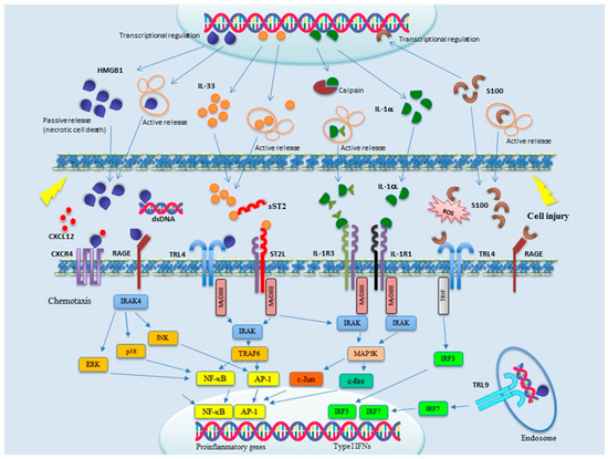 - Bertheloot, D.; Latz, E. HMGB1, IL-1α, IL-33 and S100 proteins: Dual-function alarmins. Cell. Mol. Immunol. 2017, 14, 43–64. [Google Scholar] [CrossRef]