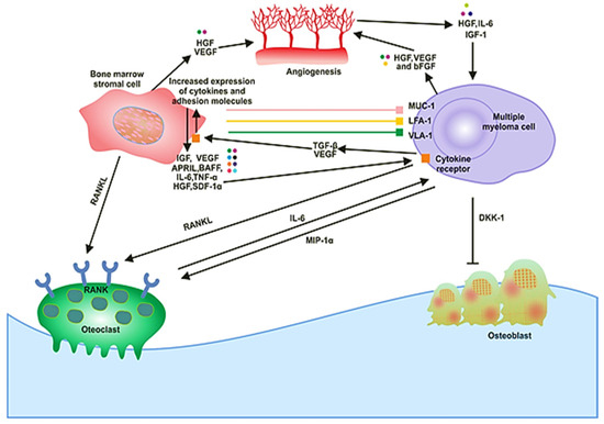 MM cells and BMSCs induce autocrine or paracrine secretion of numerous mediators [10]. BM microenvironment in MM contains high levels of IL-6, HGF, EGF, IL-2R and cytokines stimulated due to interferon-γ (IFN-γ) [11]. A number of these cytokines play a vital role in MM development by acting as growth factors of MM cells and promote cellular adhesion. There are some cytokines which are involved in osteoclastogenesis and angiogenesis [12,13,14,15]. The production of cytokines by subsets of T-lymphocytes and plasma cells in BM promotes the growth of malignant cells [10].