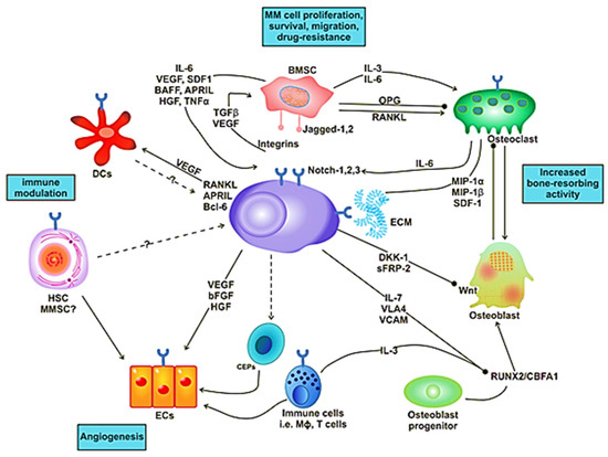 Moreover, it plays a role in the proliferation, through the mediation of the survival of MM cells by enhancing Mcl-1 and survivin expression. It increases bone resorption by osteoclast, causes angiogenesis (Figure 1), advances MGUS to the MM stage and raises microvessel marrow density (MVD). The bone damage occurs through the prevention of osteoblast formation by blocking the differentiation of mesenchymal stem cells, and it also occurs via osteoclast activation. These processes cause a reduction in bone formation and an increase in bone destruction. The growth and multiplication of MM cells in the BM are supported through the interaction of immunological, humoral, stromal and hormonal factors, as well as megakaryocytes and platelets [24]. Several novel drugs developed for MM patients based on the knowledge of the BM microenvironment target the BM microenvironment as well as the plasma cells [25].