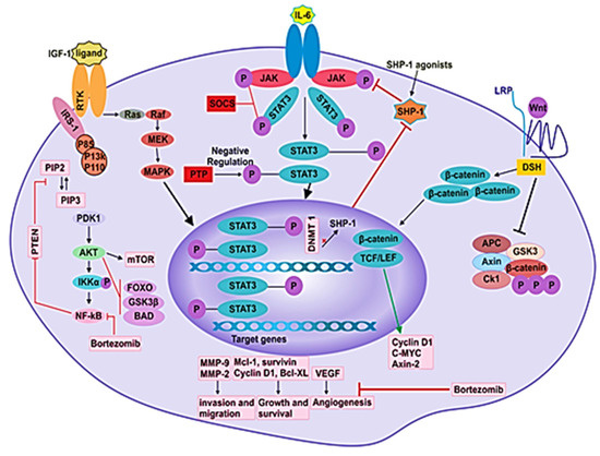 In the myeloma cells and the myeloma cell lines obtained from patients, STAT3 has been seen to be active, yet it remains inactive in the plasma cells obtained from healthy individuals [120,121]. IL-6 is a stimulator of STAT3 in myeloma. When IL-6 binds to its receptor (IL-6R), it causes the activation of tyrosine kinases that belong to the JAK family of proteins [122]. STAT3 plays a significant role in the survival, proliferation and chemoresistance of MM cells [122]. Due to the function of IL-6 as a proliferative factor in MM cells, its inhibition was considered as a therapeutic strategy for MM [10].