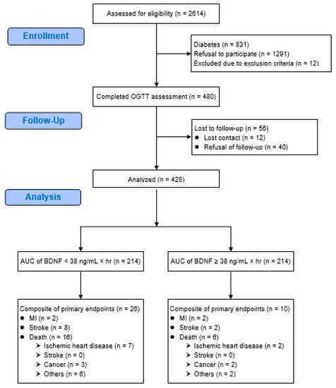 Flow diagram of the enrollment of study patients who had angina. AUC = area under the curve, BDNF = brain-derived neurotrophic factor, MI = myocardial infarction, OGTT = oral glucose tolerance test.