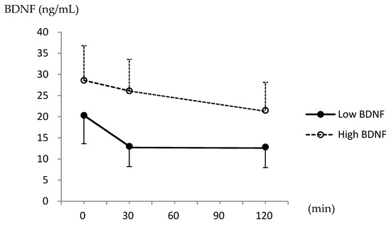 Figure 3 shows the changes in serum BDNF levels after the OGTT. Based on the repeated measurements ANOVA, the serum BDNF levels were significantly lower after glucose intake (p < 0.001), and there was a significant interaction between BDNF levels and the groups (p < 0.001). The rate of the BDNF reduction was significantly greater in the low BDNF group than in the high BDNF group in the first 30 min, and the reduction rate remained significantly different until 120 min, according to the Bonferroni correction for multiple comparisons (−29.3% ± 34.4% vs. −2.8% ± 35.4% at 30 min, and −31.4% ± 31.4% vs. −19.9% ± 31.9% at 120 min; both p < 0.001).
