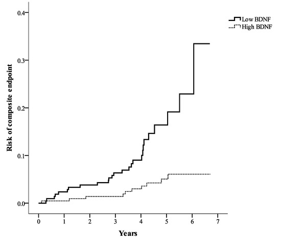 As shown in Figure 4, the risk of the primary composite endpoint was significantly higher in the low BDNF group than in the high BDNF group according to the Kaplan–Meier analysis (log-rank test, p < 0.001). To identify the hazard ratio for the primary composite endpoint, multivariate Cox regression analysis was conducted (Table 4). The risk of the primary composite endpoint was significantly higher in the low BDNF group than in the high BDNF group (hazard ratio = 3.410, 95% CI: 1.520–7.653; p = 0.003) after adjustments for associated factors selected from Table 3.