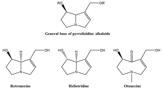 - Schoental, R. Hepatotoxic activity of retrorsine, senkirkine and hydroxysenkirkine in newborn rats, and the role of epoxides in carcinogenesis by pyrrolizidine alkaloids and aflatoxins. Nature 1970, 227, 401–402. [Google Scholar] [CrossRef] [PubMed]