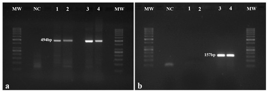 Mouse genotyping. (a) β-globin gene in mice was amplified by PCR and used as control. β-globin amplification (494 bp fragment) was observed in all mice; (b) The presence of the HPV16 early region was assessed by the amplification of the HPV16 E7 gene (157 bp fragment). As expected, amplification was not observed in wild-type mice (Groups 1 and 2 represented by Samples 1 and 2, respectively) but only in HPV+ animals (Groups 3 and 4 represented by Samples 3 and 4, respectively). MW: molecular weight marker (GeneRuler 50 bp, Thermo Scientific, Waltham, MA, USA). NC: negative control.
