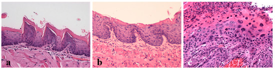 Lesions induced by the HPV16 early genes were analyzed histologically (H&E, 200×). (a) Dorsal tongue. Normal oral mucosa (HPV− mouse, Group 1); (b) Dorsal tongue. Hyperplastic changes in the oral mucosa (HPV+ mouse, Group 3). Note the increased cellularity of the basal layers and normal epithelial differentiation. (c) Dorsal tongue. Squamous cell carcinoma (HPV+ mouse, Group 3). Note the intense cell pleomorphism and disrupted epithelial architecture.