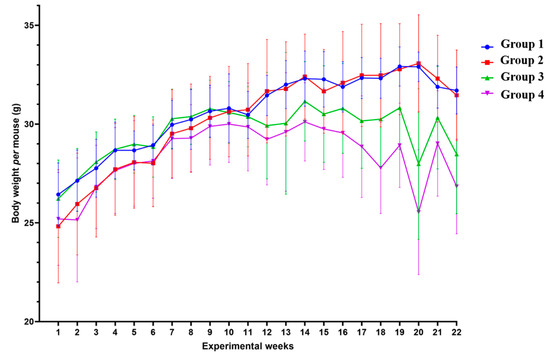 Body weight mean per mouse by group in each week of the experiment. During the 22 weeks of the experiment, transgenic mice (Groups 3 and 4) had lower body weights than matched wild-type mice—Group 3 versus Group 1: p < 0.05; Group 4 versus Group 2: p < 0.01. Among the HPV+ mice, 7,12-dimethylbenz(a)anthracene (DMBA)-exposed animals showed lower body weights—Group 4 versus Group 3: p < 0.01. Group 1: HPV− without DMBA application (n = 10); Group 2: HPV− with DMBA application (n = 10); Group 3: HPV+ without DMBA application (n = 10); Group 4: HPV+ with DMBA application (n = 10).