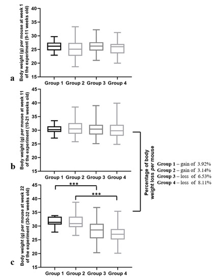Next, we performed a more detailed analysis of the animals’ bodyweights at various time points. At the first experimental week, (when the mice were 9–11 weeks old) the body weights were similar for all the groups (p = 0.100) (Figure 4a). This similarity was preserved until the 11th week of the experiment (19–21 weeks old), where all the groups showed an identical body weight per mouse (p = 0.784) (Figure 4b). However, at the 22nd week, differences in the body weights per mouse between the groups were verified (p < 0.001) (Figure 4c). Additionally, a significant decrease in the body weights in both HPV+ groups were observed when they were compared with matched controls (p < 0.001) (Figure 4c). When we compared the body weights at Week 11 of the experiment (when the mice were 19–21 weeks old) to the ones at Week 22 (when the mice were 30–32 weeks old), we observed important differences between the groups: while the HPV− mice (Groups 1 and 2) not only maintained but also gained body weight, the HPV+ mice lost 6.5% and 8.1% (Group 3 and group 4, respectively) of their body weight in this period (Figure 4b,c).