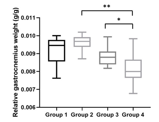 Relative gastrocnemius weights at the time of sacrifice. HPV+ mice with DMBA (Group 4) presented a lower relative gastrocnemius weight than matched HPV− mice (Group 2) (** p < 0.01). There also was a statistically significant difference between the HPV+ groups (Group 4 versus Group 3: * p < 0.05). Group 1: HPV− without DMBA application (n = 10); Group 2: HPV− with DMBA application (n = 10); Group 3: HPV+ without DMBA application (n = 10); Group 4: HPV+ with DMBA application (n = 10).