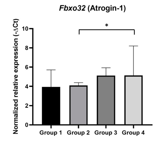 Normalized relative expression of Fbx32 mRNA in mice gastrocnemius samples. The Fbxo32 mRNA expression was normalized using the combined expression of the control genes, Hprt and Tbp. Fbxo32 expression was significantly increased in HPV+ mice with DMBA (Group 4) (* p < 0.05). Group 1: HPV− without DMBA application (n = 10); Group 2: HPV− with DMBA application (n = 10); Group 3: HPV+ without DMBA application (n = 10); Group 4: HPV+ with DMBA application (n = 10).