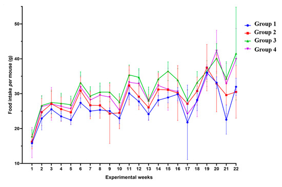 Then, the mean food intake per week was calculated for each group, and results are expressed as the mean ± standard deviation.