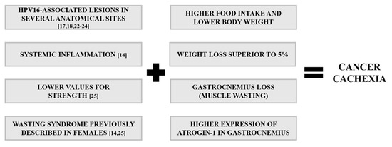 The lack of in-depth knowledge about cachexia’s pathophysiology remains a limiting factor for the diagnosis and treatment of this syndrome [8,33,34,35]. Animal models play an essential role in translational research and preclinical tests for novel therapies [14,25,36], and a number of them are available for studying cancer cachexia, predominantly tumor xenograft and syngeneic mouse models [37,38]. However, these types of models present significant limitations including their short time courses (2–25 days), often-extreme tumor burdens and excessive inflammatory status phenotypes [39,40]. Additionally, the injection site of tumor cells in the host may cause unwanted variations in the cachectic phenotype [39,40]. In fact, the animal models currently used are characterized by an abrupt and rapid cachexia with deadly wasting syndrome within a short period of time, while cachectic patients suffer from progressive alterations [41]. Therefore, it would be desirable to have a model of progressive tumor development with a more extended time course that could mimic more closely the changes observed in cancer patients [42]. In order to achieve this, genetically engineered mouse models could be a good approach, such the KPP mouse, which develops progressive cachexia associated with advancing pancreatic pathology [43]. The K14-HPV16 mice used in this study could also provide such a model of progressive development [17,18]. We recently described that these mice develop severe systemic inflammation coupled with reduced grip strength, which are important features of cachexia (Figure 10) [14,25]. The present results help to further characterize this model, describing key molecular and morphological characteristics that help to validate it for the study of cancer cachexia.