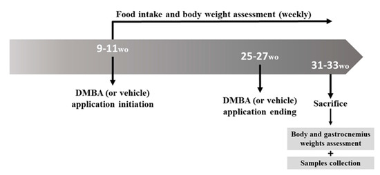 Forty 9–11-week-old male mice were allocated to four groups: Group 1 (n = 10, wild-type (HPV−) mice, without DMBA application), Group 2 (n = 10, HPV− mice, with DMBA application), Group 3 (n = 10, HPV+ mice, without DMBA application) and Group 4 (n = 10, HPV+ mice, with DMBA application). The DMBA (D3254, Sigma-Aldrich, Merck kGAa, Darmstadt, Germany) was dissolved in DMSO (CARLO ERBA Reagents S.A.S., Val de Reuil, France) and was topically administered to the penile mucosa once a week (0.031 mg/animal/week in 4 μL of DMSO). DMBA (or vehicle) administration started at 9–11 weeks of age and lasted for 17 consecutive weeks (Figure 11). All the mice were sacrificed at 31–33 weeks of age under ketamine (CLORKETAM 1000, injectable solution, Vétoquinol, Barcarena, Portugal) and xylazine (Rompun® 2%, Bayer Healthcare S.A., Kiel, Alemanha) anesthesia, by intracardiac puncture and exsanguination, as indicated by the Federation for Laboratory Animal Science Associations (FELASA). From the initiation of DMBA application, the food intake and the body weight were weekly registered for all the mice. The total body weights of all the mice were also assessed before they were humanely euthanized, and the gastrocnemius weight was assessed immediately after sacrifice (Figure 11). The gastrocnemius muscle samples were collected in TripleXtractor reagent (Grisp®, Porto, Portugal), macerated and kept at −80 °C until further use. Chest skin, ear, penis and tongue samples were also collected for histological analysis.