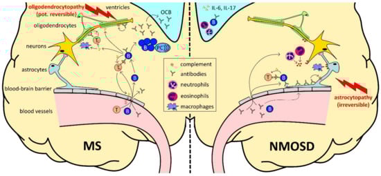 In contrast, autoantibodies directly targeting antigens within the CNS produced by peripheral B cells with the support of T follicular helper cells are key elements in the current pathophysiological understanding of NMOSD [14]. In seropositive patients, which represent 70% of all NMOSD patients, these autoantibodies were shown to target aquaporin-4 (AQP4), the most abundant water channel in the CNS, located in the astrocytic processes at the blood–brain barrier leading to a direct destruction of astrocytes [15,16]. Cortical demyelination occurs only at late stages of the disease as a consequence of irreversible astrocyte loss [17]. While the number of anti-AQP4-antibody-producing plasmablasts is strongly elevated in the peripheral blood and peaks at relapses [18], they are only infrequently found in the cerebrospinal fluid (CSF) of NMOSD patients [19]. This suggests that anti-AQP4 antibodies are mainly produced in the periphery and NMOSD may be considered a peripheral humoral autoimmune disorder [14]. Conclusively, oligoclonal bands are only found in 15–30% of NMOSD patients and mostly disappear during disease progression [20]. It is thought that anti-AQP4 antibodies require an inflammation-induced opening of the blood-brain barrier (BBB)in order to penetrate the CNS. Prior to NMOSD relapses, a subset of patients showed signs of viral infections [21]. In this line, disease progression in NMOSD only occurs in acute relapses, when immune cells enter the CNS tissue [22]. However, recent reports show that IgG antibodies themselves may increase the permeability of the BBB [23]. In addition, T cells are thought to be required for the disruption of the blood–brain barrier and the orchestration of the immune attack in the CNS [24]. Compared to MS, NMOSD patients display elevated interleukin-6 and interleukin-17 levels in the CSF along with a higher proportion of circulating T helper 17 and interleukin-17-producing cytotoxic T cells [24,25].