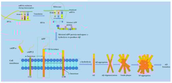 A brief mechanism of Alzheimer’s disease. The mRNA of amyloid precursor protein (APP) gene changes the process of gene transcription and translation due to the base mismatch produced by oxidation, which leads to the change of amino acid sequence of APP protein. Mutant APP protein produces more types and quantities of β-amyloid protein (A β) fragments through pathological β and γ hydrolysis pathways, and aggregates to form senile plaque (SP), to initiate the pathological process of AD [75].