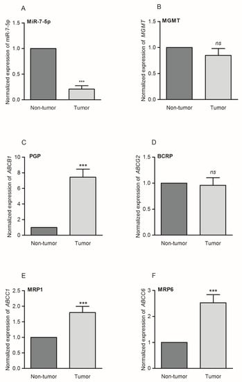 Hsa-miR-7-5p (miR-7-5p) downregulation in glioblastoma (GB) specimens (n = 23) is accompanied by alternations in the expression level of genes encoding for multidrug resistance (MDR) proteins. (A) Normalized expression of endogenous miR-7-5p; (B) normalized expression of the MGMT gene encoding for MGMT DNA repair protein; (C) normalized expression of the ABCB1 gene encoding for PGP protein; (D) normalized expression of the ABCG2 gene encoding for BCRP protein; (E) normalized expression of the ABCC1 gene encoding for MRP1 protein; (F) normalized expression of the ABCC6 gene encoding for MRP6 protein. The data, which were obtained using quantitative real-time PCR (RT-qPCR), are presented as mean ± SD. As a non-tumor control, commercial reference FirstChoice Human Brain RNA was used. *** p < 0.001; ns, non-significant.