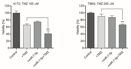 Cells transfected with miR-7-5p present an enhanced sensitivity to temozolomide (TMZ). The viability analysis (MTS assay) of GB-derived A172 and T98G cells treated with miR-7-5p and/or TMZ (100 and 200 µM, respectively) for 48 h. Cells treated with miR-negative (miR-NEG) served as a control. Data are presented as mean ± SD. ** p < 0.01.