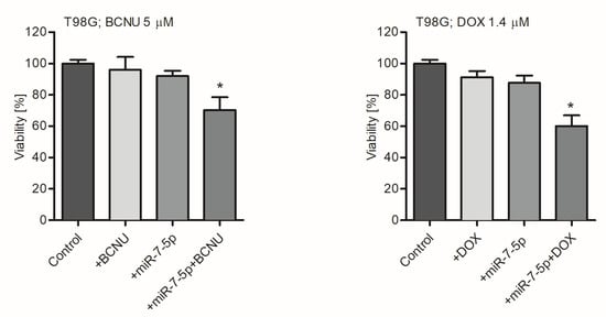 The effect of miR-7-5p is not drug-specific. MiR-7-5p sensitizes drug-resistant T98G cells to carmustine (BCNU) and doxorubicin (DOX). Viability analysis (MTS assay) of the T98G cell line treated with miR-7-5p and BCNU (5 µM; left panel) or DOX (1.4 µM; right panel) for 48 h. Cells treated with miR-NEG served as a control. Data are presented as mean ± SD. * p < 0.05.