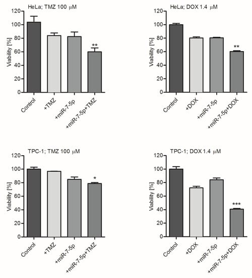 Subsequently, it was explored whether the miR-7-5p effect on tumor cell sensitivity is cell/tissue type-specific, and if it can be observed in types of tumor cells other than GB-derived A172 and T98G. To examine this hypothesis, model cell lines derived from cervical cancer (HeLa) and papillary thyroid carcinoma (TPC-1) were treated with miR-7-5p and TMZ (100 µM) or DOX (1.4 µM), as described in the Materials and Methods section. It was found that HeLa cells incubated with TMZ or DOX, in the presence of miR-7-5p, were more susceptible to chemotherapeutic agents (by 40%; Figure 4; upper panel), in comparison to controls. Consequently, the effect of miR-7-5p was observed in TPC-1 cells co-treated with drugs, wherein the viability of cells exposed to TMZ or DOX and miRNA was reduced by 20 and 60%, respectively (Figure 4; lower panel).