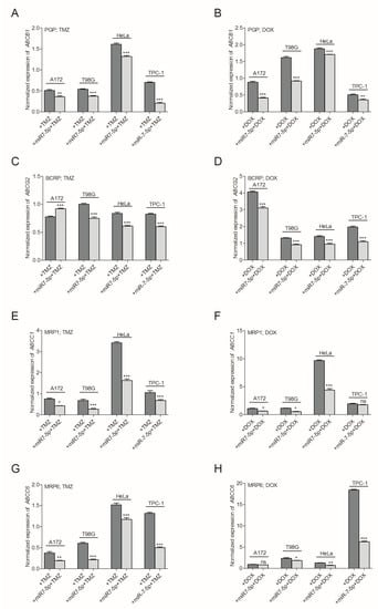 Based on the data presented in Figure 2 and Figure 4, we hypothesized that the increased sensitivity of the analyzed cells to the co-administered combination of miRNA and a drug might be a consequence of the decreased expression of MDR genes. An analysis of the ABCB1, ABCG2, ABCC1 and ABCC6 mRNA levels in A172, T98G, HeLa and TPC-1 cells revealed that the transfection of cells with miR-7-5p resulted in a significant reduction of the MDR protein-coding transcripts. This tendency was observed for the vast majority of the analyzed MDR genes in all the tested cell lines. Only the TPC-1 cells co-treated with miRNA and TMZ showed no effect on the expression level of the ABCC1 gene encoding for the MRP1 efflux pump. Further, the MRP6 transcript was not affected in A172 cells co-treated with miRNA and DOX (Figure 5).