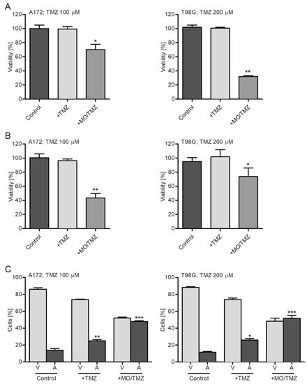 Treatment of A172 and T98G cells with TMZ-loaded MO nanoparticles results in significant reduction of the cells’ viability. Graphs present an analysis of viability (A,B; MTS and trypan blue exclusion assays, respectively) and apoptosis (C; flow cytometry) of A172 and T98G cells treated with TMZ (+TMZ; 100 and 200 µM, respectively) or TMZ-loaded cubosomes (+MO/TMZ) for 48 h. Non-treated cells served as a control. Data are presented as mean ± SD. * p < 0.05; ** p < 0.01; *** p < 0.001; V, viable cells; A, apoptotic and necrotic cells.
