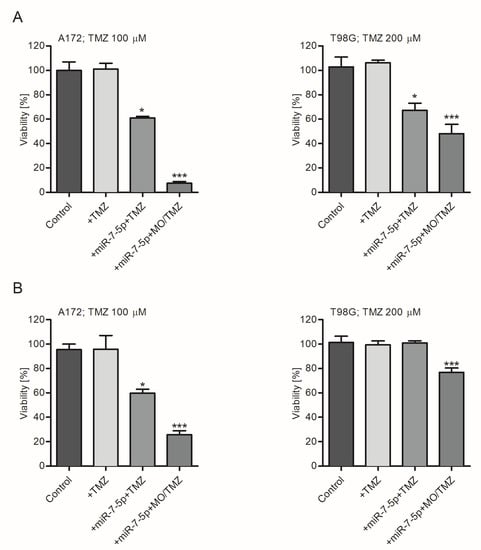 Finally, it was established that the pre-treatment of cells with miR-7-5p, followed by exposure to TMZ-loaded cubosomes, significantly enhances the sensitivity of the treated cells to the chemotherapeutic agent. The strongest reduction in the number of viable cells was observed for miRNA- and MO/TMZ-treated A172 cells (90% drop in the number of viable cells). In the case of drug-resistant T98G cells, around 50% of the cells were affected by consecutive treatments with miR-7-5p- and TMZ-loaded cubosomes (Figure 7).