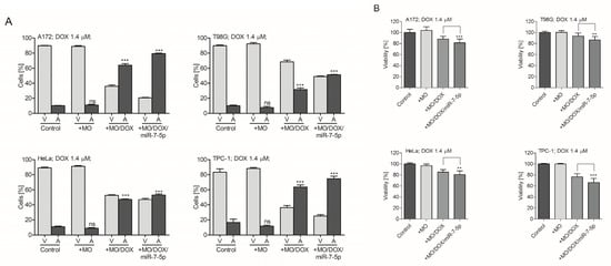 Treatment of A172 and T98G cells with DOX- and miR-7-5p-loaded MO nanoparticles results in significant reduction in the viability of cells. (A) Flow cytometry data and (B) trypan blue exclusion assays show the percentage of viable and apoptotic or necrotic A172 and T98G cells treated with empty cubosomes (+MO) or DOX-loaded cubosomes (+MO/DOX), or DOX- and miR-7-5p-loaded cubosomes (+MO/DOX/miR-7-5p), for 48 h. Non-treated cells were used as a control. Data are presented as mean ± SD. ** p < 0.01; *** p < 0.001; ns, non-significant.