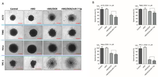 Cell lines were seeded on ultra-low attachment 96-well round-bottom plates (Corning; Corning, NY, USA) at 5000 cells per well. After 24 h, the formed spheroids were treated with empty nanoparticles or nanoparticles loaded with DOX, or DOX and miR-7-5p. Spheroids were cultured with nanoparticles for 6 days and pictures were captured using Observer D1 microscope (Zeiss; Oberkochen, Germany; 10× lens) equipped with Axio Vison LE software (Zeiss; Oberkochen, Germany). The area of spheroids was calculated using ImageJ tool (NIH; Bethesda, MD, USA). The results are presented as the percentage of spheroid area compared to controls.