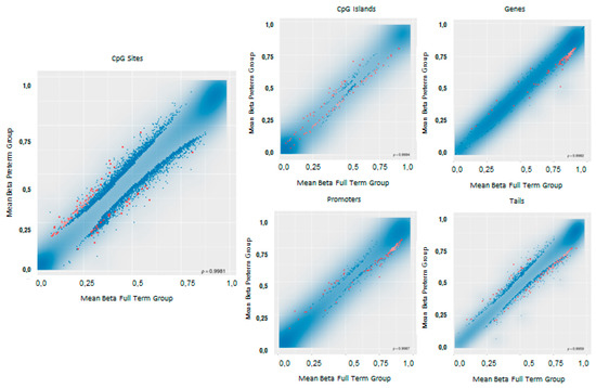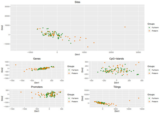 Dimensional reduction was used to visually inspect the dataset for strong signals in the methylation values. The MDS was adopted considering methylation signals from sites and also considering genomic regions: CpG islands, promoters, genes, and tiling. Results have been reported in Figure 2 and show that, considering sites (left panel) and genomic regions (right panels), there are subtle no macroscopic differences in the methylation level between preterm and full-term babies.