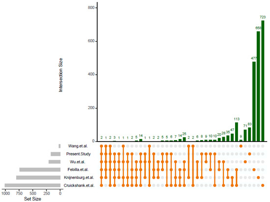 - Conway, J.R.; Lex, A.; Gehlenborg, N. UpSetR: An R package for the visualization of intersecting sets and their properties. Bioinformatics 2017, 33, 2938–2940. [Google Scholar] [CrossRef] [PubMed]