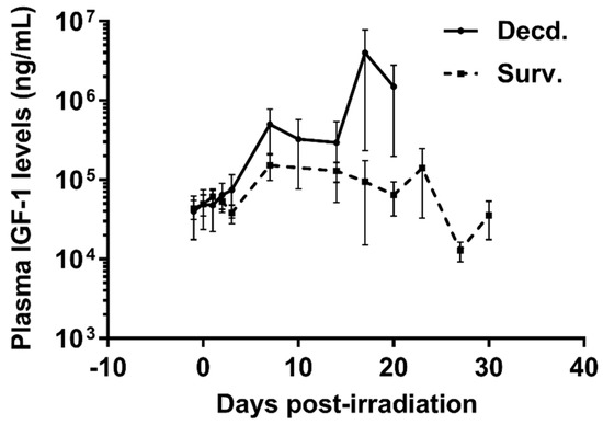 Plasma Insulin-like Growth Factor-1 (IGF-1) levels are increased in irradiated decedent Sinclair minipig (SMP). Plasma IGF-1 levels were assayed by ELISA assay at indicated days following irradiation until necropsy in survivor (Surv. n = 9) and decedent (Decd. n = 4) SMP. Note that in the days 17 and 20 post-irradiation there are measurements available from only two decedent animals.