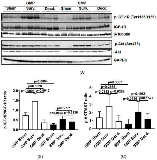 The activation of Akt as a downstream target of IGF-1 signaling in the hearts of GMP and SMP presented a pattern moderately similar to that of IGF-1R activation (Figure 2A). In survivor GMP, there was a marginal and insignificant rise in Akt phosphorylation compared to non-irradiated animals. Decedent GMP showed a significant reduction in Akt phosphorylation compared with survivor GMP. SMP survivors showed higher Akt phosphorylation than non-irradiated SMP and there was no significant change in Akt phosphorylation between survivor and decedent SMP (Figure 2A,C).