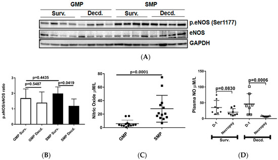 Analysis of cardiac endothelial nitric oxide synthase (eNOS) activation by phosphorylation and plasma NO level in unirradiated and irradiated SMP and GMP. (A) Western blot analysis showing the phosphorylation status of eNOS (Ser1177) in heart protein extracts of irradiated survivor and decedent SMP and GMP. GAPDH is shown as loading control. (B) Graph representing the quantification of eNOS phosphorylation (Ser1177) in the protein lysates of irradiated survivor and decedent animals by western blot. (C) Comparison of plasma NO level in non-irradiated male SMP and GMP. Each circle or square represents the measured values from one individual animal. (D) Comparison of plasma NO levels in survivor and decedent SMP one day before irradiation (Day-1, D-1) and at scheduled (day 45 for survivors) or unscheduled necropsy days for decedents. Each circle or square represents the measured values from one individual animal.