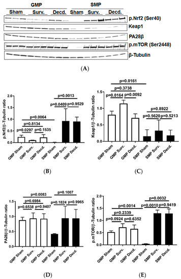 Analysis of nuclear factor erythroid 2–related factor 2 (Nrf2) activation, Keap1, mammalian target of rapamycin (mTOR), and PA28β in the hearts of sham and irradiated GMP/SMP. (A) Western blot analysis of activated Nrf2 (Ser40) transcription factor, Keap1, PA28β, and phosphorylated mTOR (p.mTOR) in heart lysates of sham and irradiated survivor or decedent GMP/SMP. β-Tubulin is shown as loading control. (B–E) Graphs representing the quantification of Western blot analysis of Nrf2 phosphorylation, Keap1, PA28β, and mTOR phosphorylation in the protein extracts of control and irradiated GMP/SMP animals. Y-axis in each graph shows the normalized ratio of respective Western blot bands to β-Tubulin as loading control.