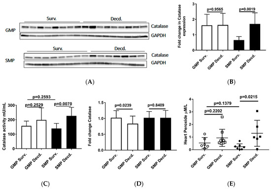 Oxidative stress is elicited by elevated intracellular levels of reactive oxygen species (ROS) that may cause damage to lipids, proteins, and DNA. Multiple enzymes such as superoxide dismutase (SOD), glutathione peroxidase (GPx) and catalase assist in ROS detoxification. Catalase is tightly associated with cellular response to oxidative stress and is responsible for catalyzing the breakdown of hydrogen peroxide (H2O2), which is generated in high levels when cellular levels of ROS increase [36]. Thus, measurement of catalase expression or activity could provide clues about the redox status of any given cell or tissue. To evaluate the catalase activity in heart samples, we measured its expression and enzymatic activity via western blot and catalase activity measurement in heart protein extracts, respectively. Our analyses showed no difference in GMP heart catalase expression or activity between survivors and decedents (Figure 5A–C). In SMP, the decedent animals had slightly higher but insignificant levels of catalase expression and significantly higher activity compared with survivors (Figure 5A–C). Catalase activity comparison between survivor GMP and SMP did not show any significant difference (Figure 5C). The Real-time PCR (or quantitative PCR, q-PCR) analysis of catalase transcripts in GMP and SMP hearts showed a slight but significant reduction in GMP decedents compared with GMP survivors (Figure 5D), with no significant findings in SMP. The heart peroxide measurement also revealed a pattern similar to catalase expression for both minipig strains. There was no difference in heart peroxide levels between survivor and decedent GMP, but in SMP, the decedents manifested significantly higher levels of peroxide than survivors. Moreover, there was no difference in heart peroxide levels between survivors of GMP and SMP (Figure 5E). The heart catalase and peroxide analyses were suggestive of higher levels of oxidative stress in GMP than SMP.